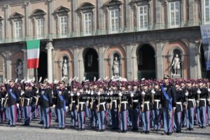 A chiusura della cerimonia, in Piazza del Plebiscito, tra la gioia ed emozione di tutti i presenti, sono atterrati con una azione di precisione i paracadutisti dell’Esercito Italiano, sventolando il Tricolore nel cielo di Napoli.