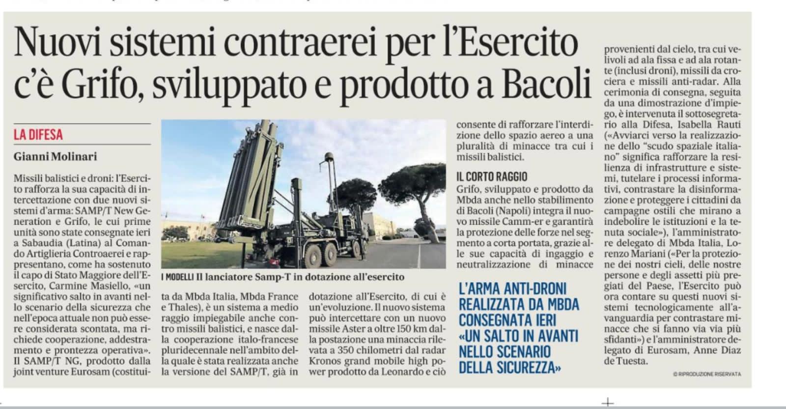 Il Mattino – Nuovi sistemi contraerei per l’esercito c’è Grifo, sviluppato e prodotto a Bacoli