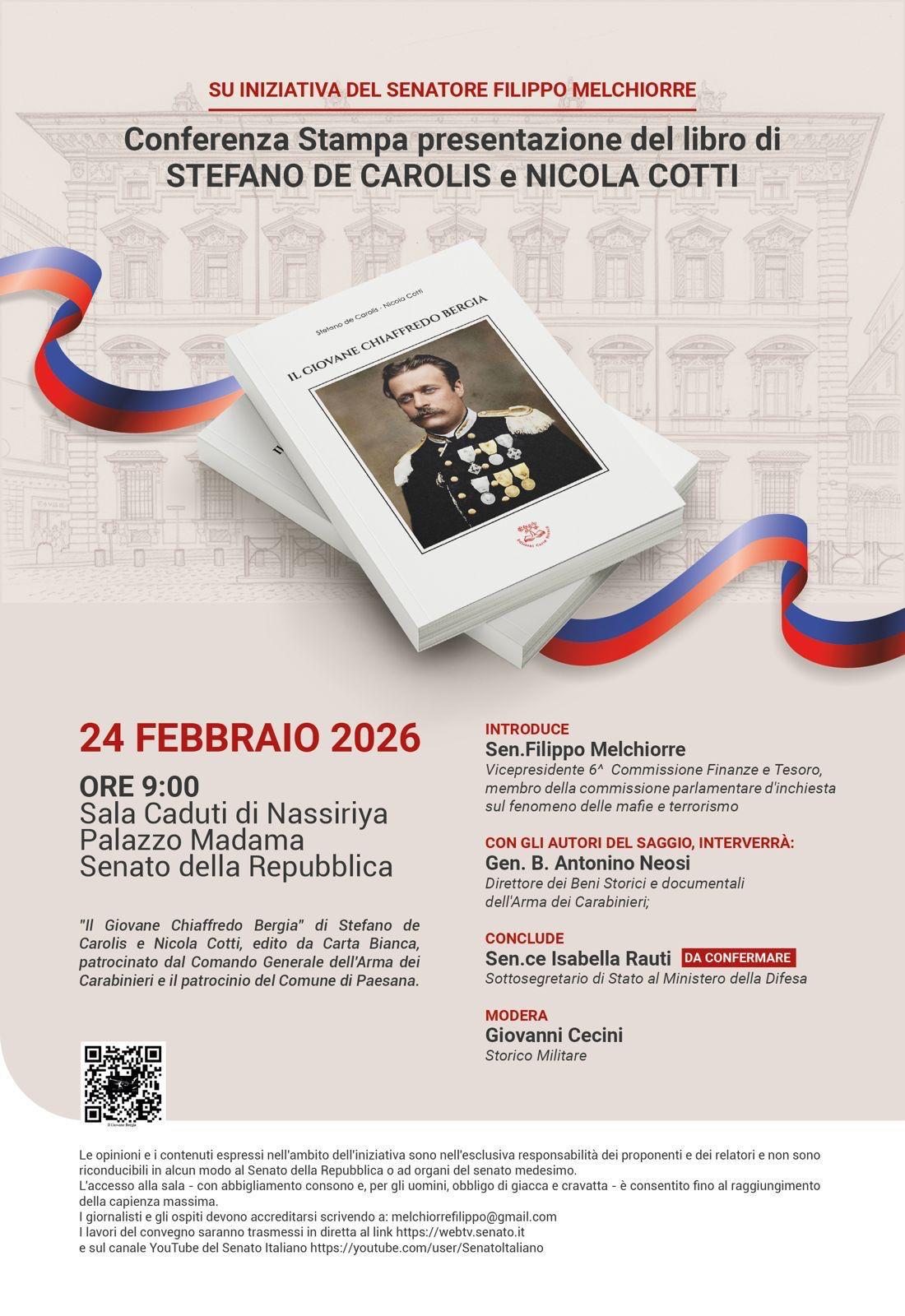 Palazzo Madama – Oggi, in Sala Caduti di Nassiriya, su iniziativa del Senatore Filippo Melchiorre, presentazione del volume “Il giovane Chiaffredo Bergia”, Medaglia d’Oro al Valor Militare dell’Arma dei Carabinieri e figura esemplare di servitore dello Stato.